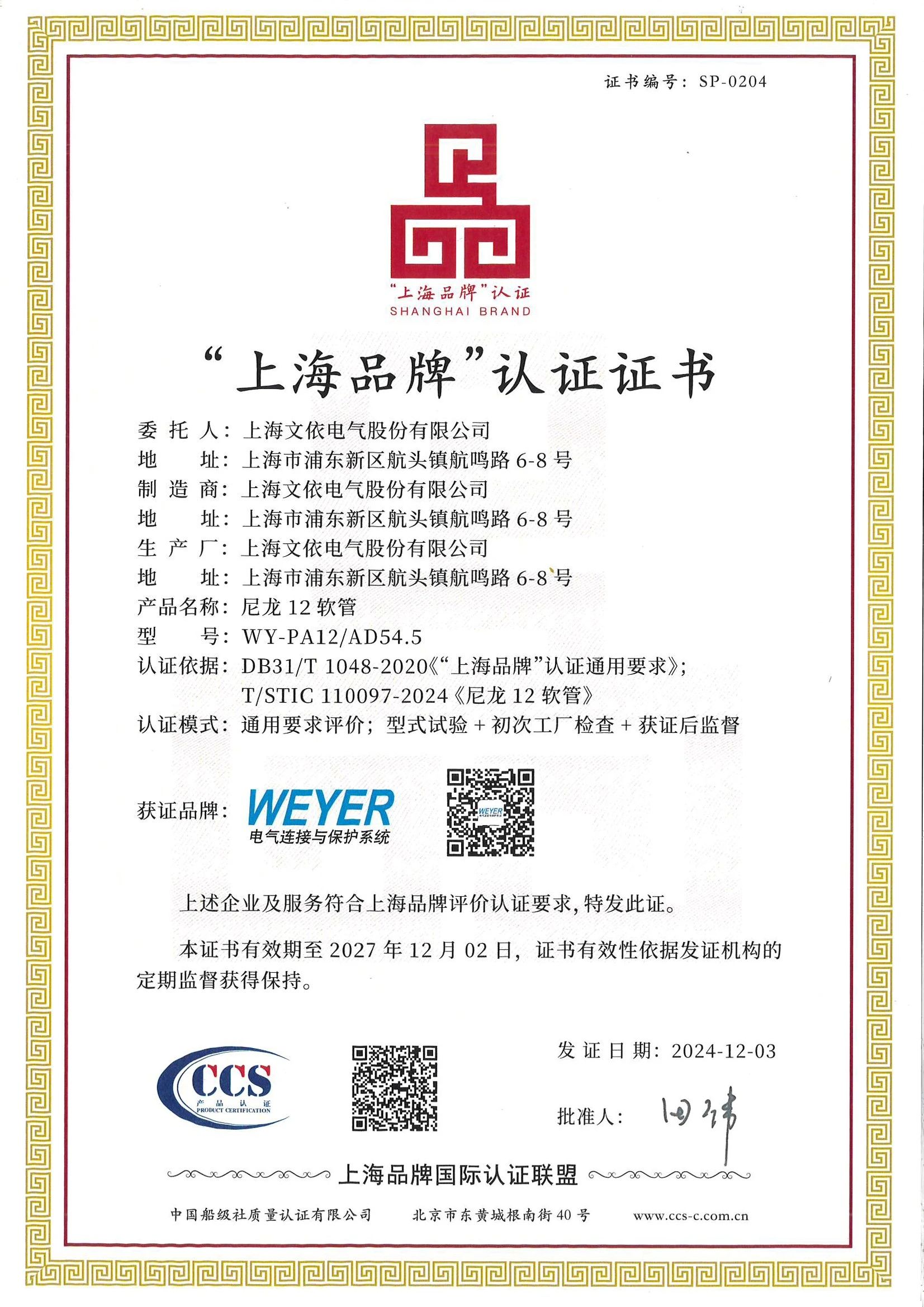 文依電氣生產的尼龍12軟管,最終順利通過“上海品牌”認證,于2024年12月獲取“上海品牌”認證證書。